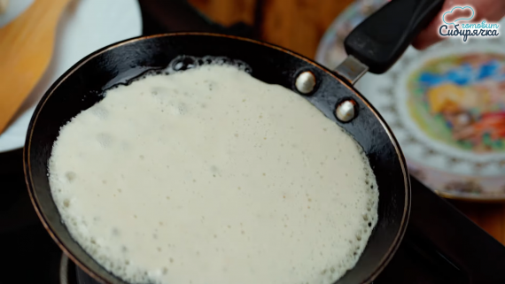По прошествии времени ставим сковороду на плиту и включаем ее на средний огонь, затем смазываем ее небольшим количеством растительного масла.