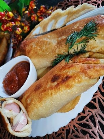 Подаем блины с сосисками и сыром