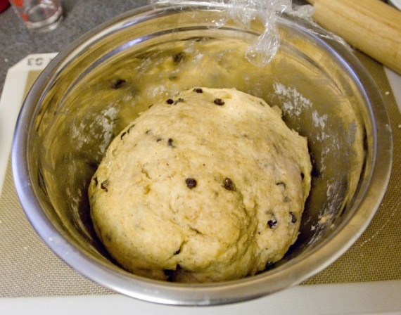 Поднявшееся тесто мягко обомните и разделите на 18-20 равных кусочков. Затем каждый отдельный кусочек разомните в руках еще раз, придав ему округлую форму. Должны получиться заготовки для булочек. Теперь разложите заготовки на смазанный маслом (или застеленный пергаментом для выпечки) противень, укройте пленкой и дайте им дойти еще, оставив тесто так на 30 минут.