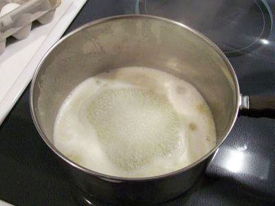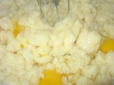 - Когда тесто сгустится, снимаем сотейник с плиты и вбиваем в него четыре куриных яйца без скорлупы.