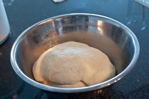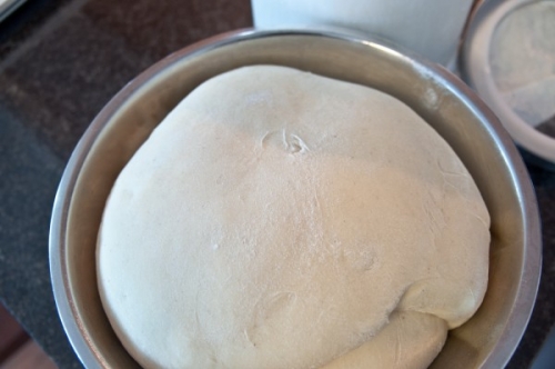 - Затем скатываем тесто в шар, кладем его в миску, смазанную 1 столовой ложкой растопленного сливочного масла, и накрываем пищевой полиэтиленовой пленкой. Ставим миску с мучным полуфабрикатом в теплое место, например возле включенной духовки или плиты. Даем ему возможность подняться в течение 1 часа и одновременно разогреваем духовку до 190 – 195 градусов Цельсия. Так же за это время подготавливаем 2 противопригарных противня, застилаем их листами пергаментной бумаги.