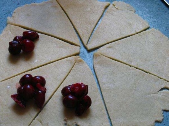 На подготовленной и слегка присыпанной мукой поверхности разложите размороженное слоеное тесто. Раскатайте его и порежьте на равные треугольники, так как это показано на фото. На основание треугольников разложите подготовленные вишни и потяните за края, скручивая тесто и придавая ему форму рогалика. Сформируйте таким образом все круассаны, начинив их вишней.