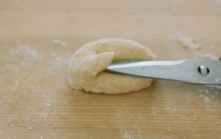 - От готового теста отщипывайте небольшие кусочки и скатывайте их между ладонями сперва в шар, а затем вытягивайте в форме куриного яйца. Готовые шарики оставьте в покое на несколько минут, чтобы тесто вновь поднялось. Затем осторожно ножницами сделайте надрезы в форме заячьих ушек.