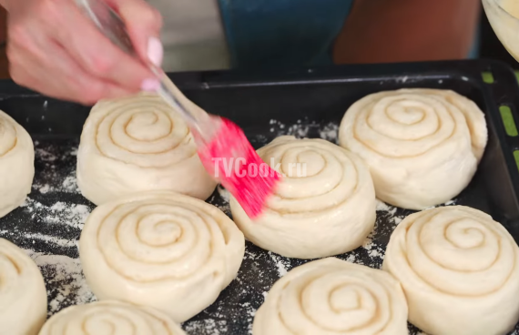 После выпечки обильно поливаем булочки сливочным соусом приготовленным из взбитых 250 гр. сметаны с 50 гр. сахарной пудры.
