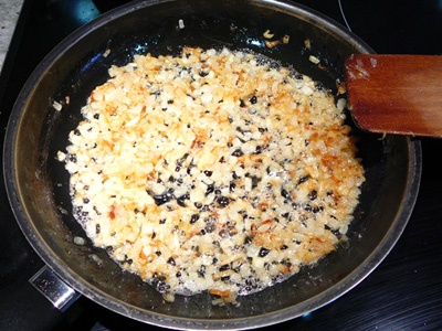 Через 4 – 5 минут лук покроется румянцем. Когда это произойдет, снимаем сковороду с плиты и ставим ее на столешницу.