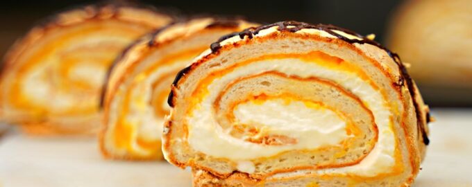 - Для декора можно растопить небольшое количество черного шоколада и сливках и украсить получившейся глазурью рулет.