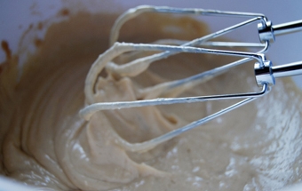 В чашу миксера перекладываем мучную смесь. Затем в эту же емкость переливаем яичный белок и желток, наливаем растительное масло и минеральную воду. Внимание: минеральную воду из бутылки желательно переливать в емкость чаши непосредственно перед замесом теста, для того, чтобы из жидкости заранее не вышел газ. Включаем миксер на среднюю скорость и на этой скорости очень тщательно перемешиваем все ингредиенты до образования однородной, жидковатой, пузырчатой массы. В процессе вымешивания теста следите за тем, чтобы в муке не образовались комки.