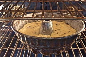 - Потом перекладываем готовое сладкое тесто в охлажденную форму для запекания и ставим в разогретую духовку на средний стеллаж. Выпекаем кекс в течение 35–40 минут. Спустя первые полчаса проверяем уже воздушное изделие на готовность.