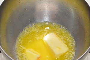 Оставшееся масло разрезаем на кубики, отправляем их в небольшой сотейник, ставим на средний огонь и растапливаем до жидкой консистенции, постоянно помешивая столовой ложкой, чтобы не пригорал. Затем при помощи кухонного полотенца переставляем его ближе к приоткрытому окошку и остужаем жидкий жир до комнатной температуры.