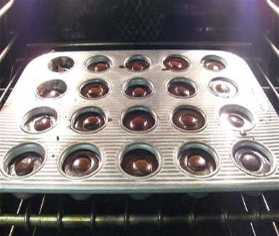 - Острым ножом разрежьте пару кексов и посмотрите достаточно ли в каждом жидкого шоколада, это поможет вам определиться с порциями конфет, которые вы кладете в жидкое тесто. Повторно смажьте формы сливочным маслом и тем же способом приготовьте вторую порцию кексов.