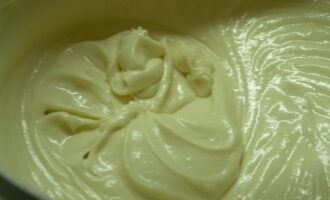 – — Готовность масляно-яичная смеси можно проверить, следующим образом. Возьмите немного смеси, и разотрите между пальцами. И если не прощупывается сахар, то смесь готова. Масляно-яичная смесь в итоге должна получиться гладкой, очень нежной, прямо шелковистой.