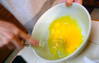 Разбиваем яйца с помощью ножа прямо над миской. С помощью ручного венчика слегка взбиваем ингредиент до появления однородного желтого цвета.