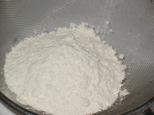 С помощью сита просеиваем муку в среднюю миску, чтобы она насытилась кислородом, в тесте не попадались комочки, а само блюдо получилось нежное и мягкое. Внимание: лучше всего параллельно с мукой в инвентарь добавить и разрыхлитель для теста. И хорошо перемешав эти два компонента столовой ложкой прямо в сите, просеять их в среднюю емкость.