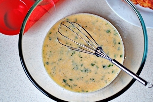 - Соедините яично-молочную смесь с зеленью и сыром, перемешайте до однородности.