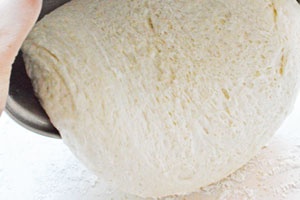 - И начинаем замешивать столовой ложкой тесто. Когда этот кухонный прибор перестанет помогать, продолжаем данный процесс чистыми руками, периодически подсыпая очередную порцию муки. В итоге должно получиться мягкое, нелипкое, эластичное, слегка маслянистое тесто. Скатываем его в шар, снова отправляем в миску, прикрываем кухонным полотенцем и ставим настаиваться возле включенной плиты подальше от сквозняков на 1–1,5 часа.