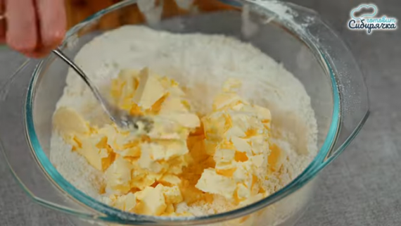 - Выкладываем в миску с мукой нарезанные кусочками 250 гр. размягченного маргарина для выпечки.