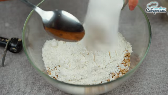 - Высыпаем в миску с орехом и семечками 80 гр. пшеничной муки и 250 гр. сахара.