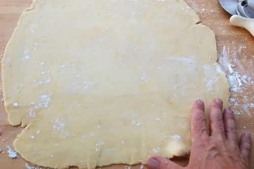 - Теперь возьмите круглый или обычный нож и разрежьте раскатанное тесто на квадраты, вдоль и после поперек.