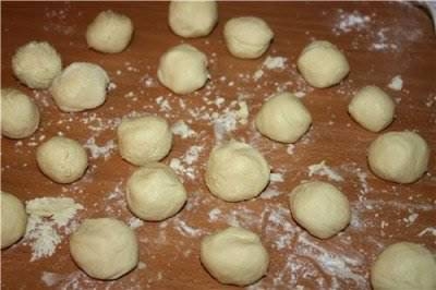 Сливочное масло рубим мелкими кубиками, добавляем сахарную пудру и ванильный сахар и растираем (можно слегка взбить при помощи миксера). Добавляем к массе яйца и снова тщательно перемешиваем. Соединяем между собой просеянную через сито муку, крахмал, соду и добавляем к маслу и яйцам. Вымешиваем массу до состояния однородного пластичного теста белого цвета. Готовое тесто разделаем на шарики размером примерно с грецкий орех.