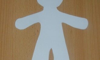 - Изготовьте шаблон пряничного человечка из плотного листа бумаги. Это поможет вырезать одинаковых размером фигурки из теста.