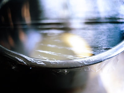 - Готовое тесто скатываем в шар, укладываем в чистую миску, смазанную 1 столовой ложкой растительного масла, накрываем емкость полиэтиленовой пищевой пленкой и затем кухонным полотенцем.