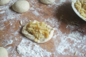 - В это же время включаем духовку на разогрев в 190 градусов Цельсия и ставим на столешницу пару противопригарных противней, если они качественные, с толстым дном, тогда оставляем в таком виде, в каком есть, если от старого духового шкафа, тогда застилаем пекарской либо пергаментной бумагой. Спустя четверть часа шарики из теста поднимутся, слегка приминаем их ладонью и по очереди немного раскатываем скалкой, так чтобы получились лепешки толщиной около 1,5 сантиметров. На середину каждой выкладываем примерно по 1,5–2 столовые ложки капустной начинки.