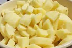 Воспользовавшись овощерезкой, очищаем картофель от кожуры и после тщательно промываем под проточной теплой водой, чтобы удалить остатки земли и другой грязи. Далее выкладываем клубни на разделочную доску и ножом рубим крупными кусочками. Перемещаем их в среднюю кастрюлю и заливаем обычной холодной водой так, чтобы она на 2–3 пальца покрывала компоненты.