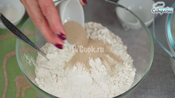 Выкладываем в глубокую миску 500 гр. заранее просеянной пшеничной муки высшего сорта, высыпаем в нее 0,33 ч.л. соли, 1 ч.л. разрыхлителя, 50 гр. сахара, 1 ч.л. ванильного сахара, 2 ч.л. сухих быстродействующих дрожжей и перемешиваем все сухие ингредиенты.