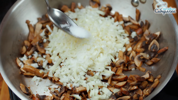 Довольно мелко нарезаем 1 головку репчатого лука, который затем выкладываем в сковороду с грибами, добавляем по вкусу соль и перемешиваем между собой все ингредиенты в сковороде.