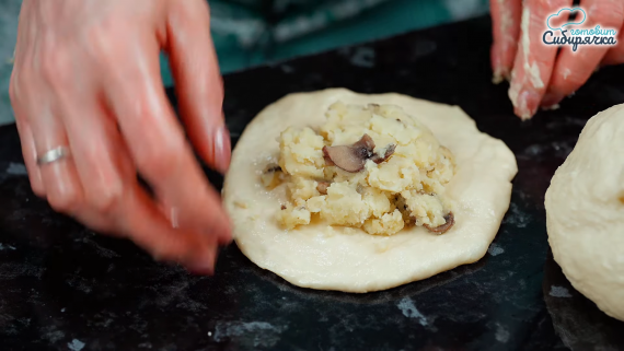 Каждый кусочек теста разминаем до лепешек и на каждую из них выкладываем нужное количество начинки.