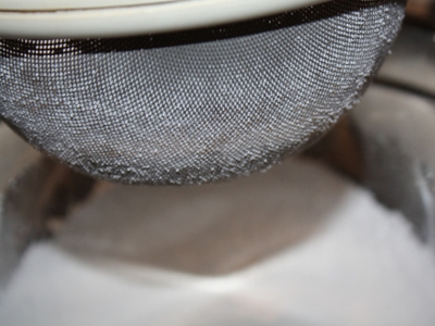 Чтобы мука была без комков и пышной, просеиваем ее через сито в чистую миску. Для приготовления нашего пирога берем пшеничную муку высшего сорта и мелкого помола.
