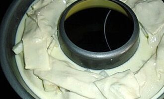 - Теперь очень важно определиться с формой. Рекомендую использовать специальную объемную форму для кексов. Тогда десерт лучше запечется и будет красивого праздничного вида рождественского кулича. Форму слегка смазываем кусочком сливочного масла или маргарином и начинаем выкладывать слои. Первый ряд будет кусочки слоеного теста. Поверх тестового ингредиента выкладываем кусочки яблока и посыпаем их сахаром по вкусу. Если придерживаться нужного количества составных частей десерта, должно получиться 4 слоев из теста и 3 слоя – из яблок. Чередуя ряды, последним выкладываем ряд из теста.