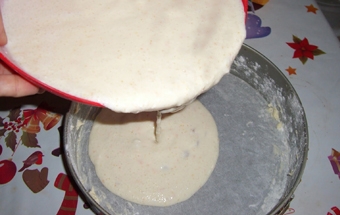 В миску с манно-сметанной смесью переливаем из чаши миксера сахарно-яичную массу и с помощью столовой ложки или ручного венчика хорошо перемешиваем между собой все ингредиенты до однородной массы. После этого в эту же емкость постепенно и небольшими порциями пересыпаем мучную смесь и, воспользовавшись тем же столовым инвентарем, хорошо вымешиваем тесто. Его консистенция не должна быть густой, а примерно такой, как для оладий. Внимание: если тесто получилось жидковатым, тогда в него необходимо добавить немного муки. Но следите за тем, чтобы тесто не получилось густым, тогда пирог может плохо подняться.