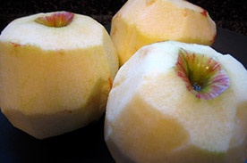 - Яблочки хорошо промываем под проточной теплой водой и выкладываем на разделочную доску. Воспользовавшись ножом, очищаем фрукты от кожуры и разрезаем на две части. Из каждой половинки удаляем плодоножку и семенную коробочку.