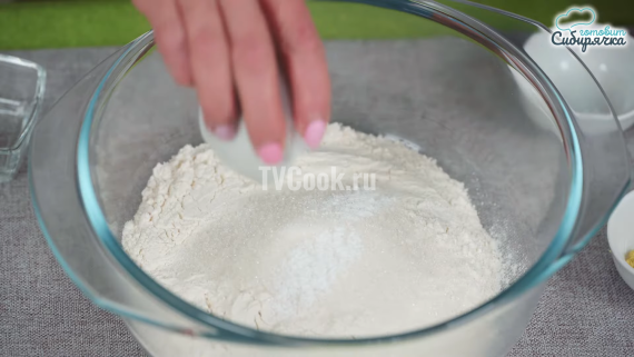 Высыпаем в глубокую миску с предварительно просеянной пшеничной мукой высшего сорта 0,10 ч.л. соли, 30 гр. сахара и 0,5 ч.л. разрыхлителя.