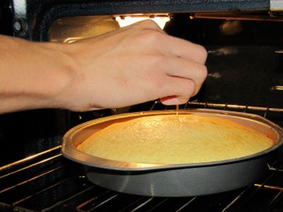 - Выпекайте корж в течение 25 – 30 минут. После откройте духовку и проверьте готовность теста, просто введите в средину коржа деревянную зубочистку и достаньте ее, если на конце деревянной палочки будут влажные кусочки теста, дайте пирогу дойти в духовке до полной готовности еще 5 – 7 минут. Если палочка будет сухой, значит корж готов.