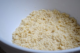 В миску с просеянной мукой добавляем мягкие кусочки сливочного масла, а также высыпаем сахар и пищевую соду. Воспользовавшись вилкой, перетираем все до состояния мелкой крошки. Это и будет наше тесто.