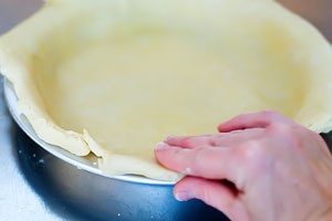 - Приминаем тесто ладонями, так чтобы оно равномерно легло на внутреннюю поверхность выбранной посуды, и кусочки свисающего мучного полуфабриката подворачиваем вниз, одновременно пальцами делая рельефный узор по кромке, теперь выпечка получится не только вкусной, но и красивой.