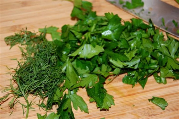 - Переместите всю зелень на разделочную доску и нарубите кухонным ножом на мелкие кусочки. Можно прямо сразу смешать кусочки укропа, петрушки и шпината между собой.