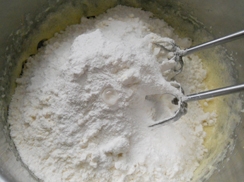 - Теперь, в кефирную смесь небольшими порциями просеиваем муку и сразу же после этого перемешиваем все подручным инвентарем.