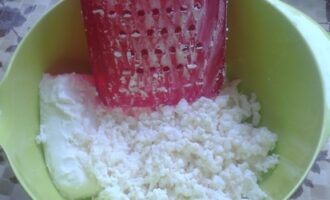Пока наше тесто отдыхает, мы приготовим начинку. Оставшиеся яйца отварим в крутую и почистим от скорлупы. В миску натрем на крупной терке нашу брынзу. Можно конечно измельчит и в блендере или мясорубке, но на терке мне удобнее. В натертую брынзу добавляем творог и мелко порезанные лук, яйца и петрушку. Тщательно все перемешаем, чтобы зелень равномерно распределилась в творожно-сырной массе.