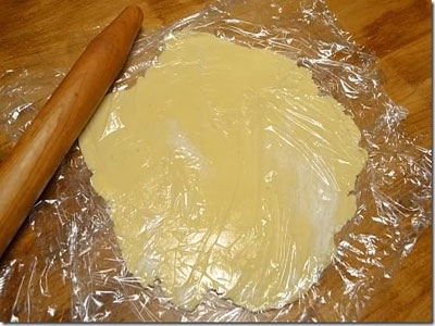 - Через 20 минут проверяем тесто, если оно немного поплыло, добавляем в него муки и слегка обминаем. Затем берем кусочек полиэтиленовой пищевой пленки, кладем его на кухонный стол, на пленку выкладываем тесто и посыпаем его тонким слоем муки.