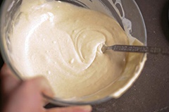 Яично-сахарную массу перекладываем в чистую среднюю миску и начинаем небольшими порциями добавлять сюда просеянную муку. Параллельно с этим все интенсивно перемешиваем столовой ложкой или ручным венчиком, чтобы не образовывались комки. В итоге у нас должно получиться густое тесто по консистенции чуть круче, чем на оладьи.