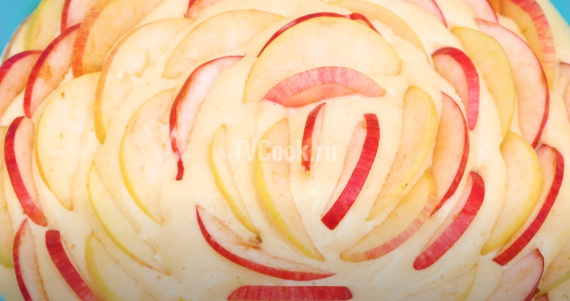 Форму выстелить пергаментом или смазать сливочным маслом, припылить мукой. Вылить ½ часть теста, выложить половину яблок нарезанных дольками, сверху залить тестом и выложить оставшиеся яблоки. Если нарезать яблоки кубиками, то можно их добавить в тесто, аккуратно перемешать и потом выложить всю массу в форму для выпекания.