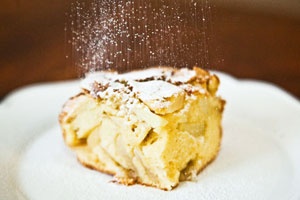 После приготовления этот великолепный десерт посыпают сахарной пудрой, пропитывают медом, смазывают кремом или взбитыми сливками, разрезают на 6–8 порций и сервируют на тарелках вместе с любимыми напитками: кофе, чаем, какао, теплым молоком, йогуртом либо тем, что больше нравится. В отличие от классической шарлотки, эта получается более воздушной, нежной и просто тает во рту. Наслаждайтесь!