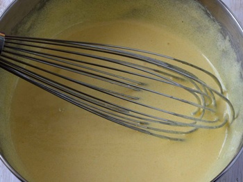 - В маленькую миску или глубокую тарелку разбиваем яйцо, добавляем еще яичный желток, а также сливки, молоко, высыпаем молотую корицу, измельченный мускатный орех и соль. С помощью миксера на низкой скорости взбиваем все до образования однородной массы. Сразу же после этого переливаем эту смесь в емкость с сахарно-мучной массой и снова все хорошо взбиваем подручным инвентарем до однородности.