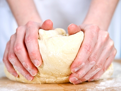 Хорошо наточенным ножом (тесто не любит, когда его натужно пилят) режем шарик на четыре примерно равные части. Каждую из них надо раскатать в довольно большой и тонкий блин, посыпав перед этим стол слегка мукой. Толщиной не более 2 мм! Кстати о раскатке. По началу выпечка у меня получалась из рук вон плохо: грубое и «неподъемное тесто» частенько даже не пропекалось. Помогла мама подруги — ее скалка практически не касалась теста, настолько легкими были движения. Минимум давления — и передо мной лежал пласт не толще нитки.