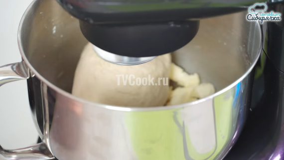 Замешиваем тесто в чаше миксером 7 минут, затем добавляем в чашу с тестом 45 гр. размягченного сливочного масла и вымешиваем тесто до необходимой консистенции еще 2 минуты.