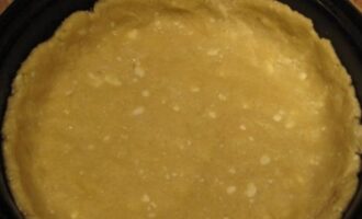 - Тесто раскатываем в лист чуть больший, чем форма, в которой будет готовиться пирог. Очень важно, чтобы противень или форма была с бортами, хоть и небольшими. Смазываем ее сливочным или растительным маслом. Далее выкладываем лист теста в форму, припуская на ботики. Заливаем начинку на лист теста.