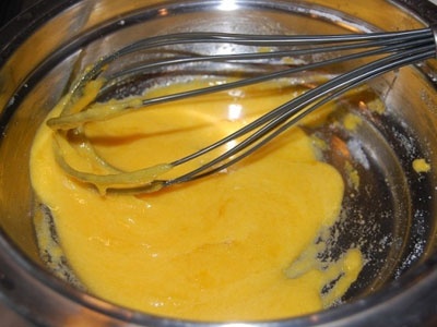 - Как только на поверхности жидкости появятся первые пузырьки, уменьшаем температуру плиты на самый маленький уровень, и непрерывно помешивая ароматную массу венчиком, доводим ее до сгущения. На приготовление крема уйдет не более 15 – 16 минут, а может даже меньше. Когда масса сгустится, снимаем кастрюлю с плиты, придерживая ее кухонным полотенцем. Вводим в почти готовый крем 50 грамм сливок, перемешиваем их с основной массой до однородности и даем крему остыть до комнатной температуры, периодически помешивая венчиком, чтобы на поверхности крема не образовалась пленка. Одновременно разогреваем духовку до 180 градусов Цельсия.